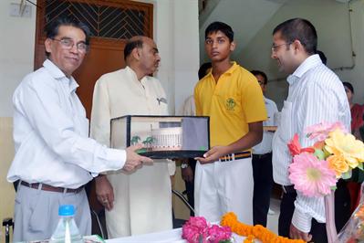 Student presenting model of Parliament to world famous Scientist Dr. T Ramasami Secretary Department of Science and Technology Government of India.
